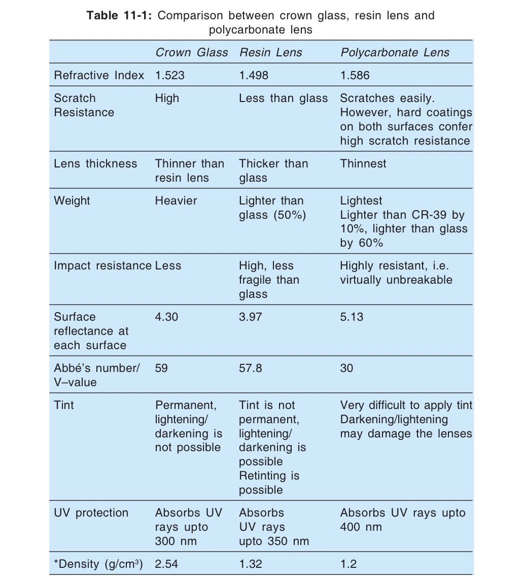 POLYCARBONATE LENS เป็นวัสดุเทอร์มอพลาสติก จะอ่อนตัวหรือขยายตัวเมื่อได้รับความร้อน และอาจจะหดตัวเมื่ออยู่ในสภาพอากาศหนาวเย็น มีดัชนีการหักเหของแสงอยู่ที่ 1.586 ดังนั้นจึงมีความบางกว่า CR - 39 lenses