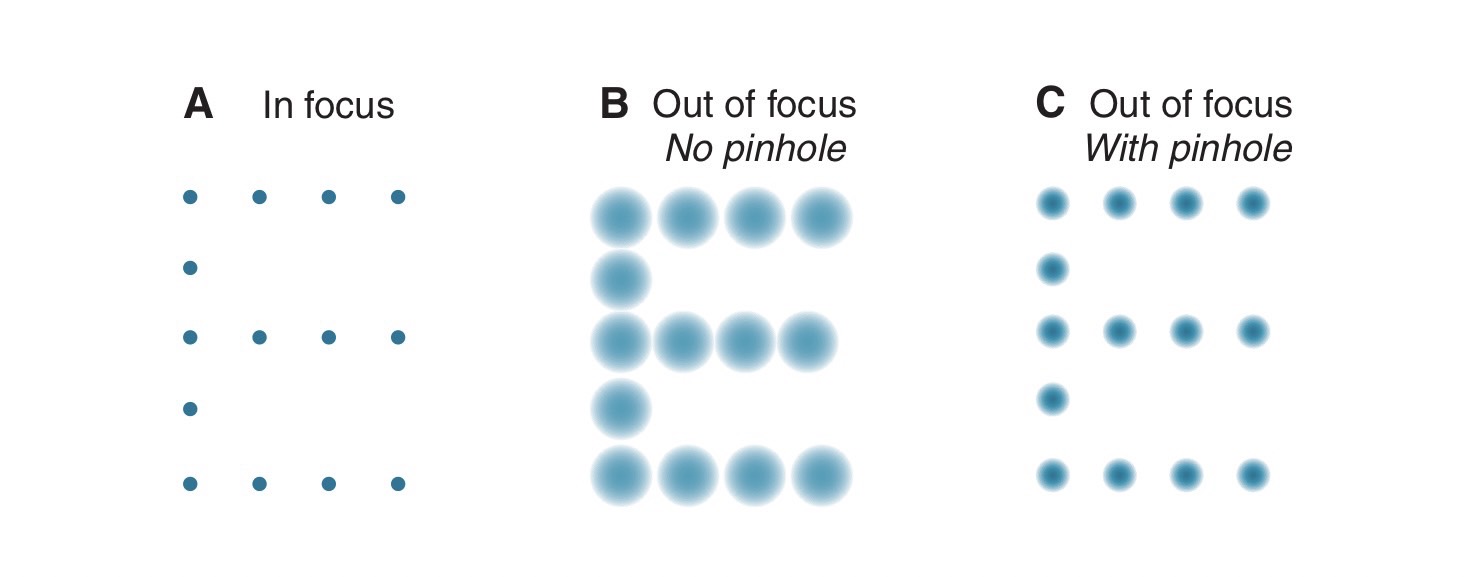 การมองผ่าน Pinhole คือการมองผ่านรูขนาดเล็ก ซึ่งมีขนาดที่เล็กกว่า รูม่านตาหรือ Pupil ทำให้ขนาดของ Blur Circle บริเวณจอตามีขนาดเล็กลง และมี Depth of focus เพิ่มมากขึ้นด้วย