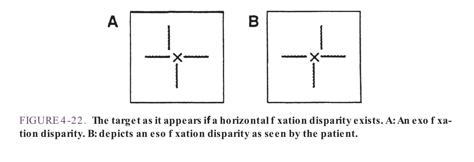 ในรูป A เส้นบนอยู่ฝั่งซ้ายของเส้นล่าง แสดงว่าภาพจากตาขวาและตาซ้ายมีการ Cross กัน ในกรณีนี้จะเรียกว่า Exophoria หรือตาเขตาเหล่ซ่อนเร้นออกด้านนอก ตำแหน่งตาเหล่ออกไปทางด้านหู
