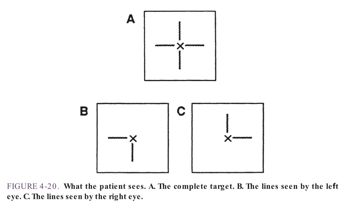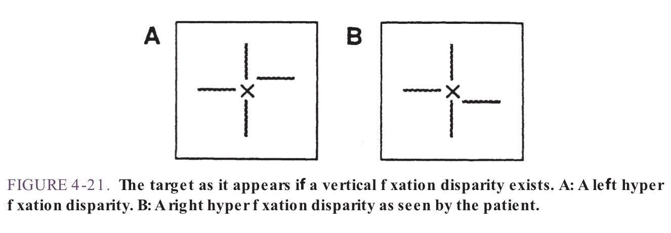 ถ้าคนไข้มีปัญหา เกี่ยวกับ vertical fixation disparity หรือมีปัญหา ตาเขตาเหล่ในแนวดิ่ง ( Hyperphoria / Hypophoria ) คนไข้จะเห็นเส้นในแนวตั้งทั้งเส้นบนและเส้นล่างอยู่ตรงกัน แต่จะเห็นเส้นในแนวนอน ฝั่งซ้ายและขวาไม่อยู่ในระนาบเดียวกัน จะมีเส้นใดเส้นหนึ่งอยู่สูงกว่าหรือต่ำกว่า ดังเช่นในรูปที่แนบมานี้