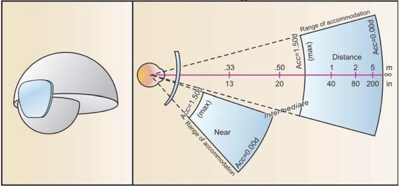 Near : พื้นที่ใช้งานในการมองใกล้ มีระยะการใช้งานอยู่ที่ประมาณ 30 - 40 ซ.ม. สำหรับการอ่านหนังสือ ดูโทรศัพท์มือถือ หรือทำเอกสารต่างๆ จะอยู่บริเวณส่วนล่างของแผ่นเลนส์