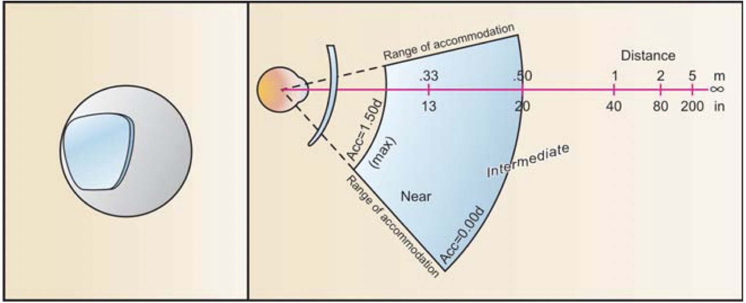Intermediate : พื้นที่ใช้งานในการมองระยะกลาง อยู่ที่ระยะประมาณ 50 - 80 ซ.ม. สำหรับการใช้งานคอมพิวเตอร์ มองคอนโซลหน้ารถ จะอยู่บริเวณส่วนกลางของแผ่นเลนส์ เชื่อมต่อระหว่างโซนมองไกลด้านบนและมองใกล้ด้านล่าง จะค่อยๆมีการเปลี่ยนแปลงกำลังสายตาและความโค้งของผิวเลนส์จากตำแหน่งมองไกลจนถึงตำแหน่งมองใกล้ เราสามารถเรียกตำแหน่งนี้ว่า Progressive Zone