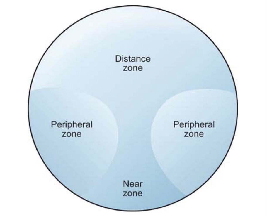 โครงสร้างของโปรเกรสซิฟเลนส์ จะมีพื้นที่ใช้งาน แบ่งออกเป็น 3 โซน