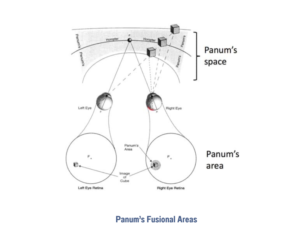 Panum’s Fusional Areas คือพื้นที่ใน Retina ของตาแต่ละข้าง จะเกิดขึ้นเมื่อภาพของวัตถุที่ตกบน Retina ของตาทั้ง 2 ข้าง ไม่ได้ตกลงบนจุด Corresponding Retinal Points ซึ่ง ถ้าภาพของวัตถุตกลงบนบริเวณของ Panum’s Fusional Areas ของ Retina ของตาแต่ละข้างจะเห็นเป็นภาพภาพเดียวเสมอ