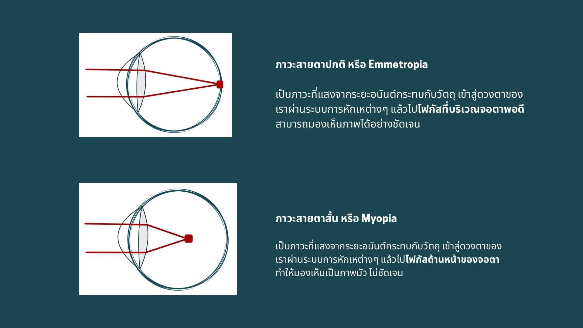 ในคนที่มีสายตาปกติ หรือ Emmetropia การมองเห็นภาพๆหนึ่ง จะเกิดขึ้นได้เมื่อแสงจากระยะอนันต์กระทบกับวัตถุ เข้าสู่ดวงตาของเราผ่านระบบการหักเหต่างๆ แล้วไปโฟกัสที่บริเวณจอตาพอดี จึงจะสามารถ “มองเห็นภาพนั้นๆได้อย่างชัดเจน”