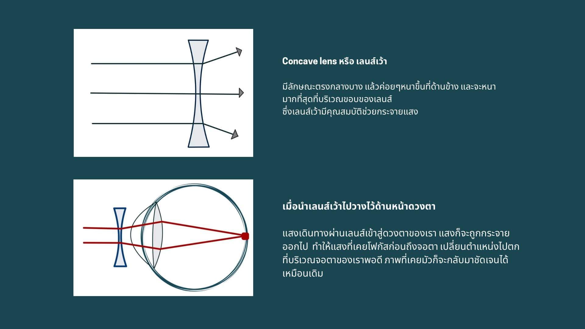 คำตอบก็คือ = การใช้เลนส์เว้า หรือเลนส์ลบ วางไว้ด้านหน้าดวงตา เพื่อผลักแสงให้ถอยหลังไปโฟกัสที่จอตาของเราพอดี