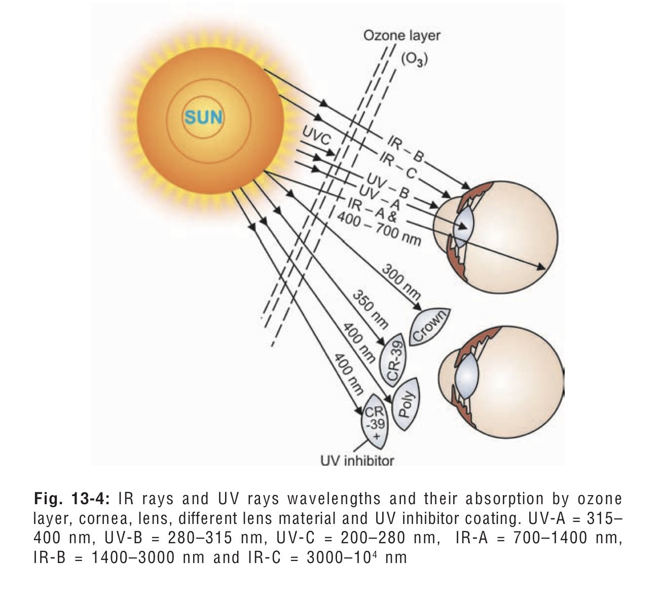 ดังนั้น จอตาจึงได้รับการป้องกันจากรังสี UV และการได้รับรังสี UV ในปริมาณน้อยๆแต่ได้รับเป็นเวลานาน จะเป็นสาเหตุทำให้เกิดต้อกระจก ( Cataract ) ซึ่งในคนที่ไม่มีเลนส์แก้วตา ( Aphakia ) และในคนที่ใช้เลนส์แก้วตาเทียม ( Pseudoaphakia eyes ) จะได้รับกับแสงสีน้ำเงินและแสงสีม่วงเพราะไม่มีตัวดูดกลืนแสงรังสี UV ดังนั้น ในเลนส์แก้วตาเทียม ( IOL : Intraocular Lens ) จึงมีการชุบสารยับยั้งรังสี UV-A ที่เรียกว่า Chromophores เพื่อปกป้องจอตา