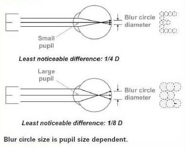 2. ขนาดของรูม่านตา หรือ Pupil size : ขนาดของรูม่านตามีการเปลี่ยนแปลง หด/ขยาย ในขณะที่ Optical image ยังคงอยู่ที่ตำแหน่งเดิม ในขณะที่รูม่านตาขยายมากขึ้น ขนาดของ Blur circle จะใหญ่ขึ้นและในขณะที่รูม่านตาหดตัวเล็กลง ขนาดของ Blur cirle จะลดลงด้วย