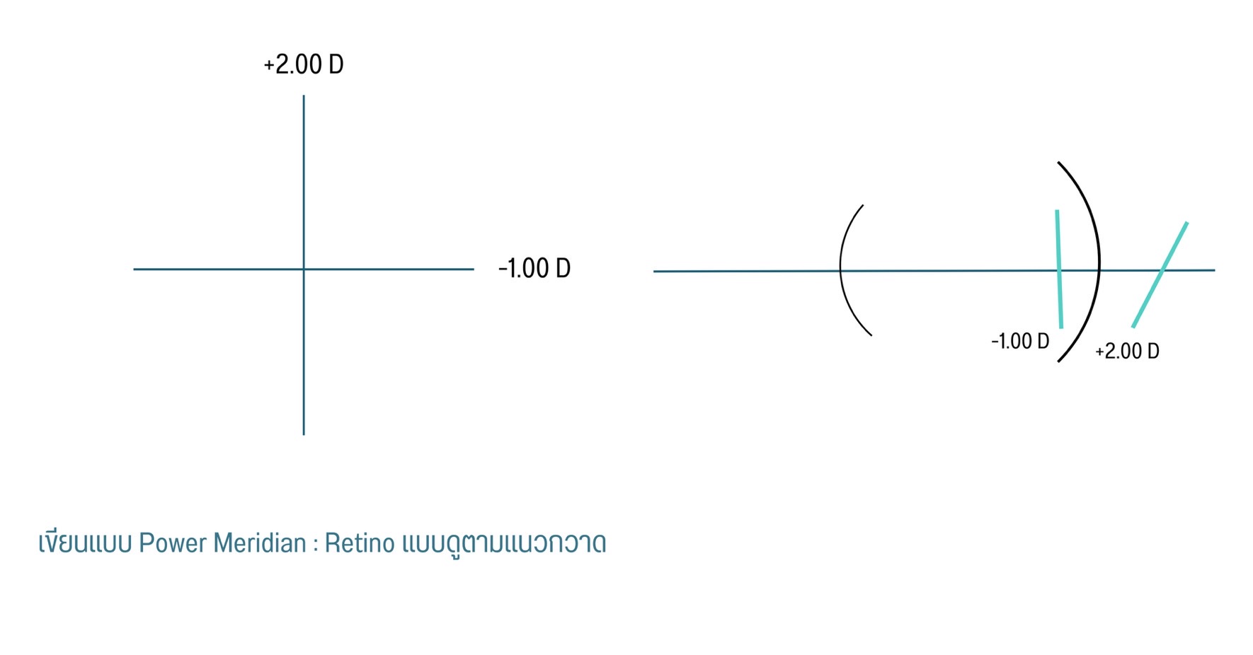 เมื่อนำมาเขียน Power cross จะสามารถเห็นการตกของ Focal line แต่ละแกนได้ว่าตกที่ตำแหน่งไหน ก่อน หลัง หรือบริเวณจอตาพอดี